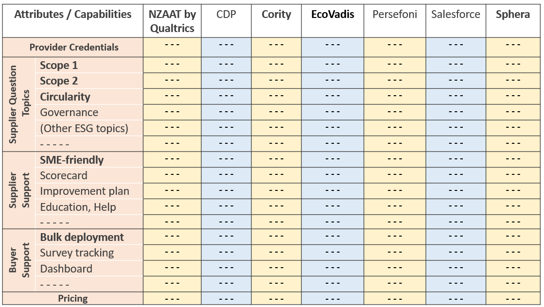 I have done a side-by-side comparison of how six other online supplier GHG questionnaires provided by CDP, Cority, EcoVadis, Persefoni, Salesforce, and Sphera meet 24 desired criteria for an online, rapidly-scalable version of NZAAT. The comparison uses a bid appraisal-like format to facilitate selection of the offering that best meets a particular buyer’s needs. The comparison is available here.